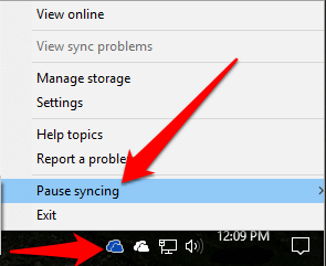 - To do this, find OneDrive in the notification area and then select More > Pause syncing.
