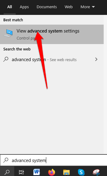 - To enable automatic page file management, type advanced system in the search bar and select View advanced system settings.