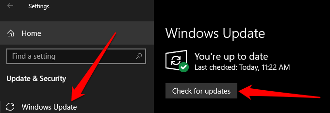 - Select **Windows Updates** on the left pane and then select **Check for updates**.
