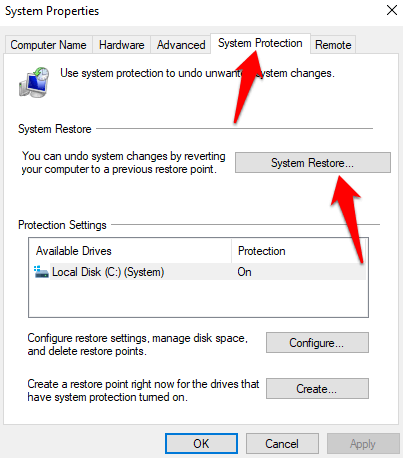- To perform a System restore, search for Create a restore point and then select its result to open the System Properties application.