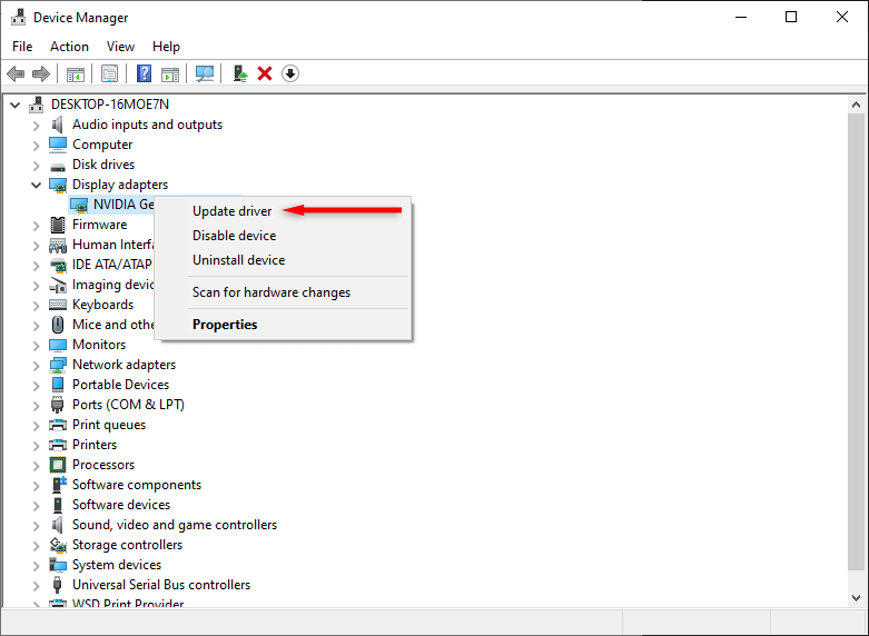 - Next, ensure the display driver is up-to-date by opening Device Manager, clicking Display adapters, right-clicking your graphics driver, and selecting Update driver.