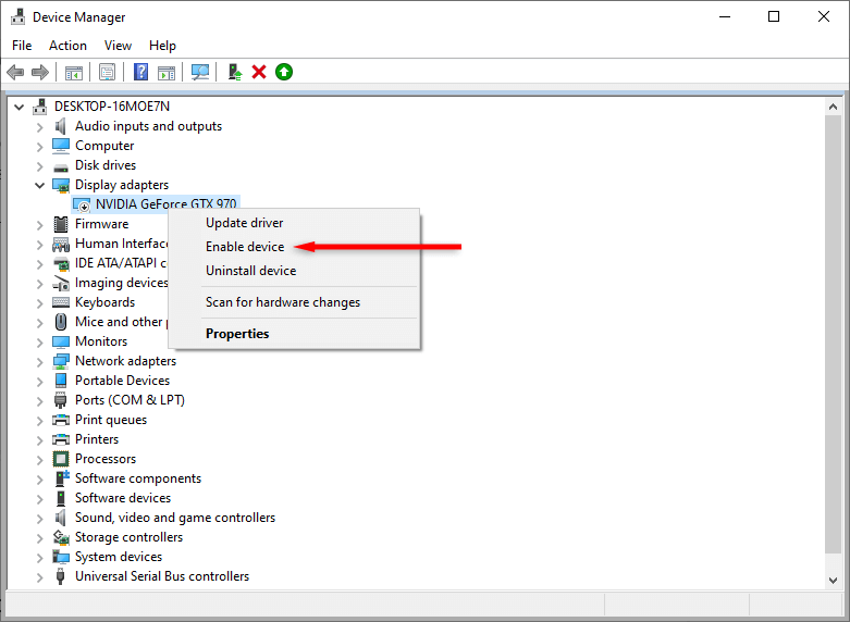 - Right-click it one more time and click Enable device.