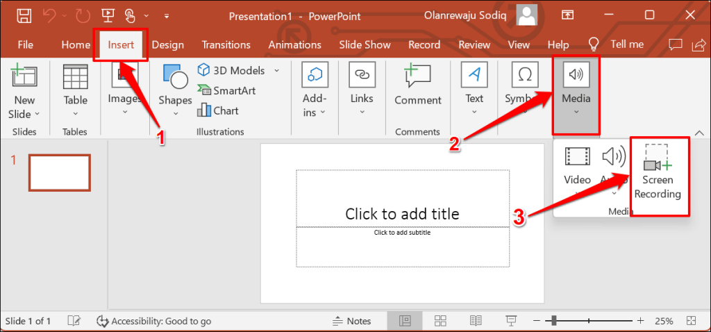 - Head to the Insert tab, select the Media drop-down option, and select Screen Recording.