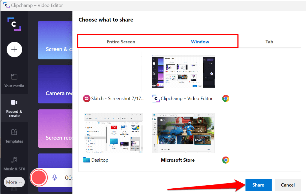 - Select if you want to record the entire screen or a specific app. Choose the screen or window you want to record and select Share to proceed.