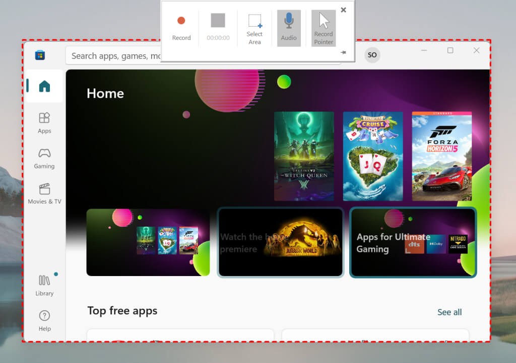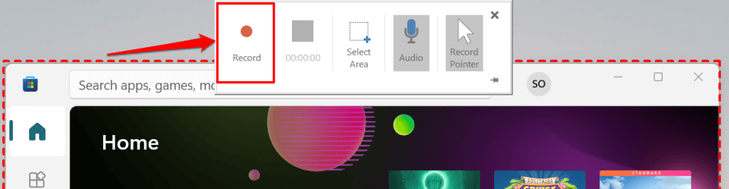 - Select the Record icon on the Dock to start recording visuals (and audio) in the selected screen area. You can also start recording with the Windows key + Shift + R shortcut.