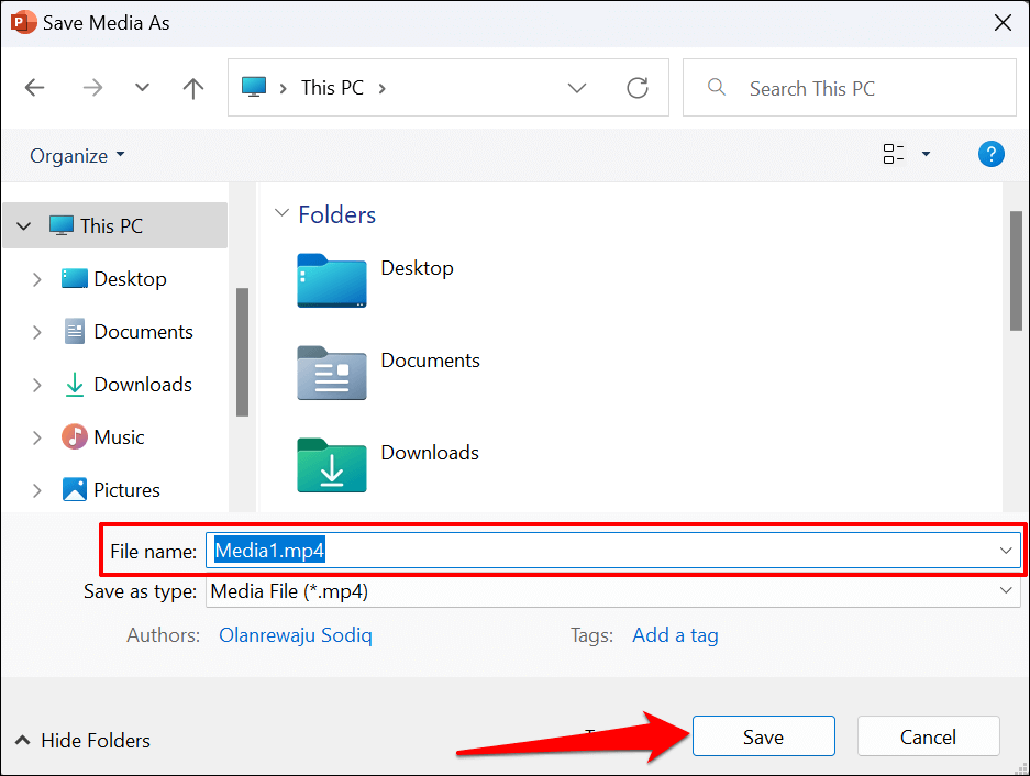 - Powerpoint will generate an MP4 video file of the recording. Rename the video file, select a destination folder, and select Save.
