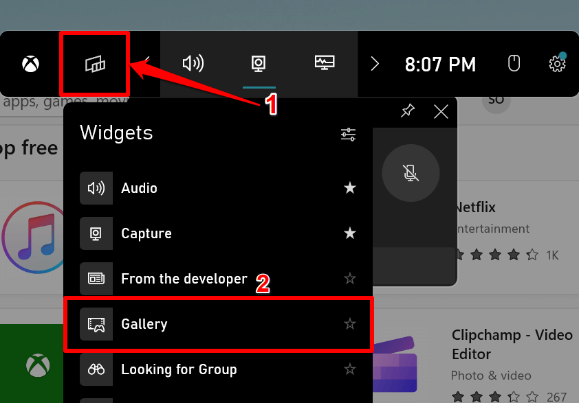 Alternatively, open the Xbox Game Bar (Windows key + G), select the Widget Menu icon, and select Gallery.