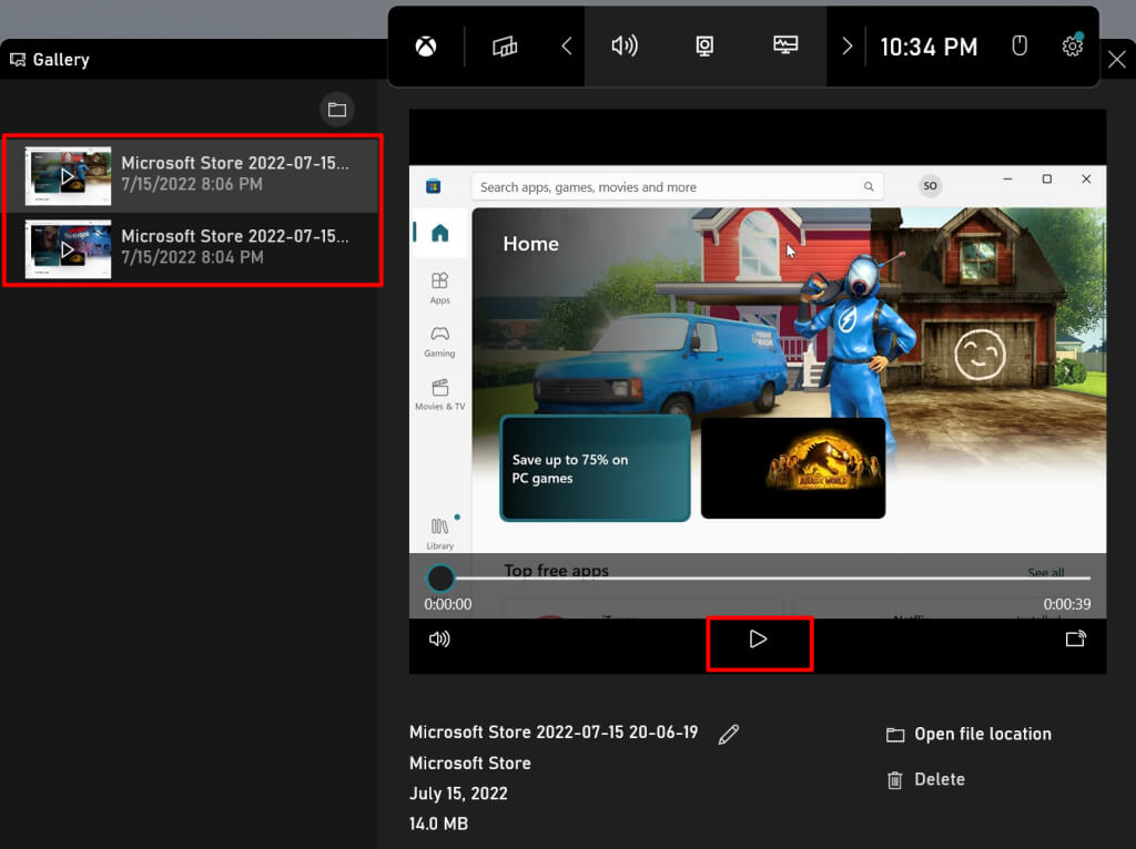 - You should see a list of screenshots and recordings captured with the Xbox Game Bar. Select a recording on the left sidebar and select Play to view the clip.