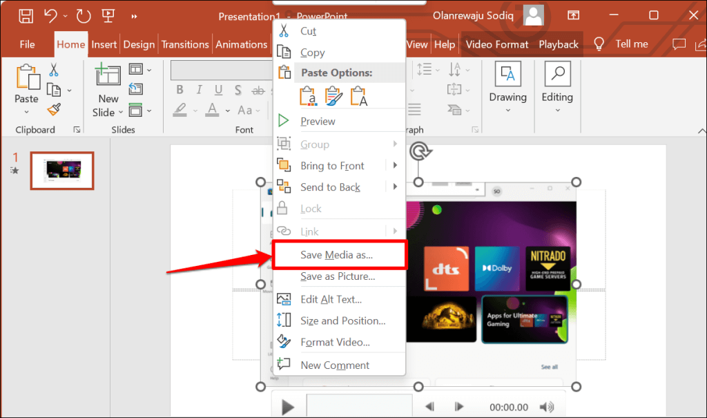 - When you stop recording, Powerpoint will insert a video file of the recording in the presentation. To export the recording to your computer, right-click the video and select Save Media as.