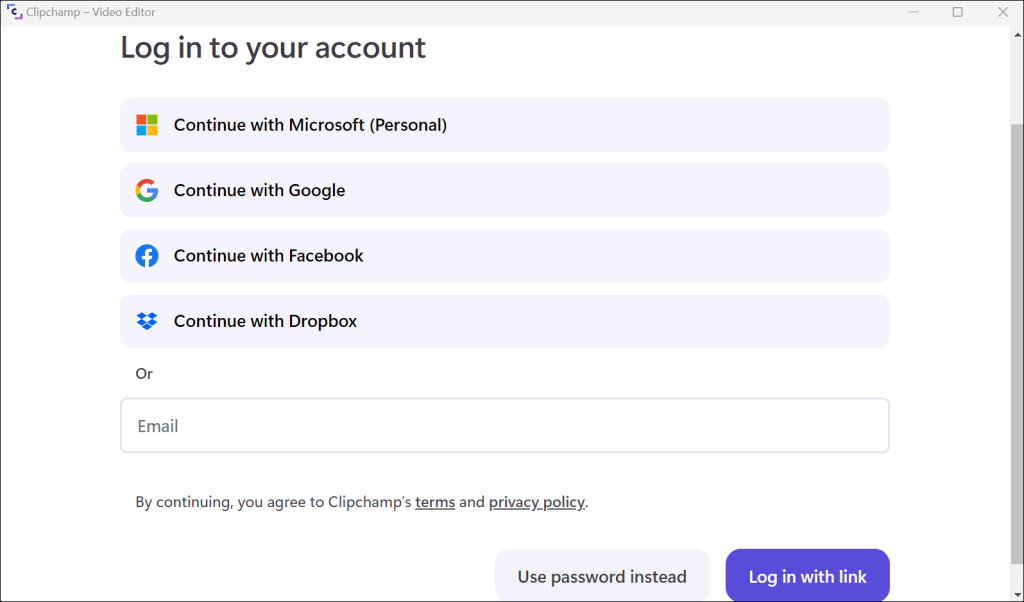- Sign in to Clipchamp with your Microsoft, Google, Facebook, or Dropbox account. You can also create a new Clipchamp account with your email address.