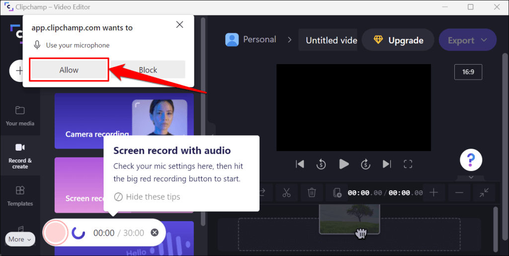 - Select Allow on the pop-up to grant Clipchamp access to your computer’s microphone.