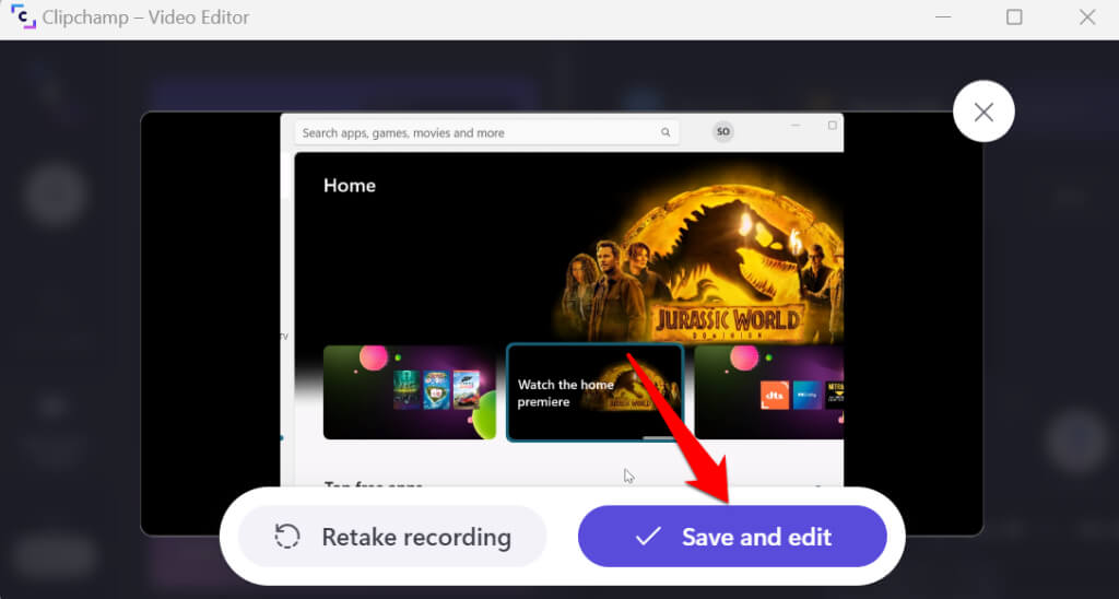 - Preview the video recording and select Save and edit to export the clip to your PC’s “Downloads” folder.