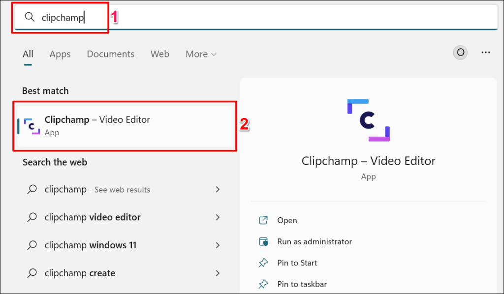 - Open the Start menu, type clipchamp in the search bar, and select the Clipchamp app.