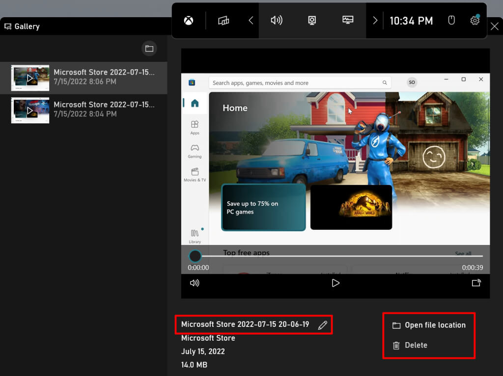 - Select Open file location to view where the screen recording is stored on your computer. Select Delete to remove the clip from your PC permanently. You can also rename the screen recording by selecting the pen icon next to the preset title