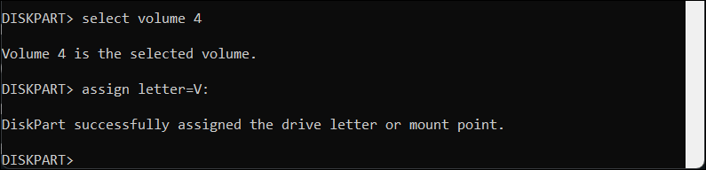 - If the EFI partition does not have a drive letter assigned, assign one by typing assign letter=V: replacing V with your desired drive letter.