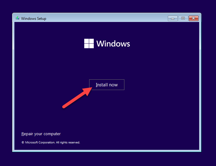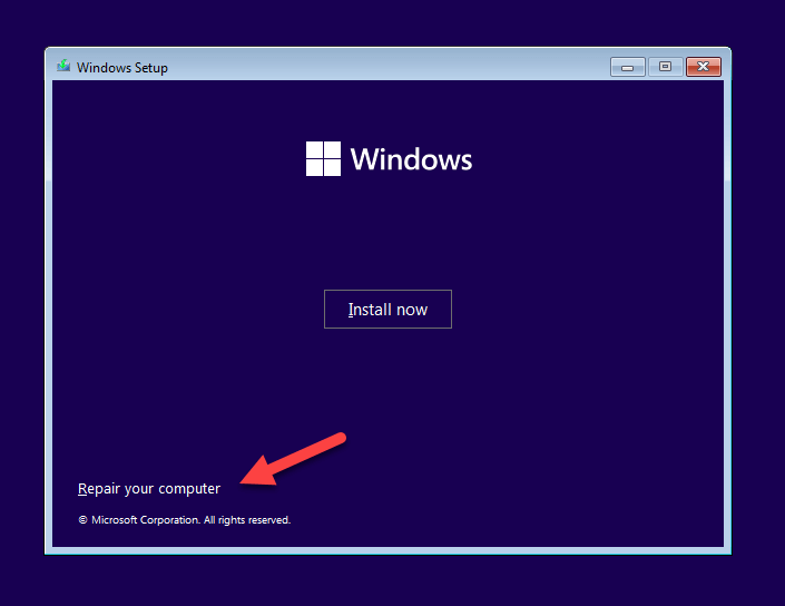 - To begin, boot into your Windows installation media and press Repair your computer in the installation menu.