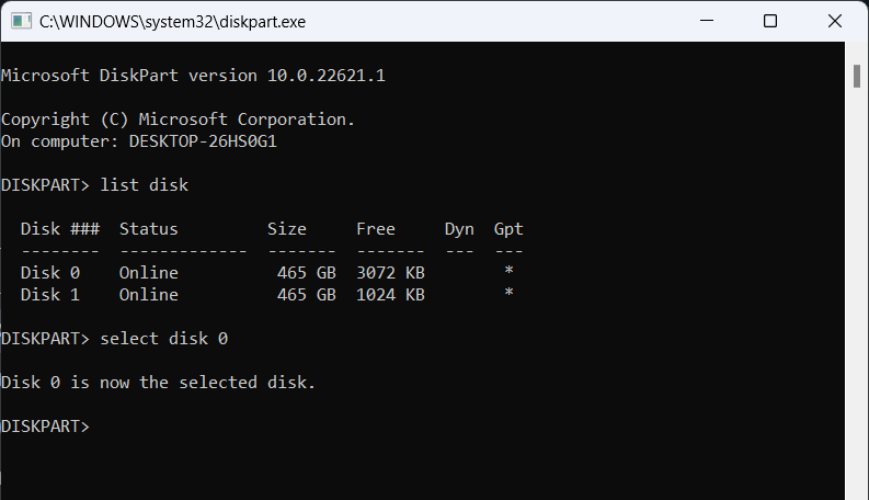 - In the cmd window, type diskpart and press Enter. * Enter list disk to display a list of all available disks connected to your computer. * Determine the disk where Windows is installed, and enter select disk #, replacing # with the appropriate disk number.
