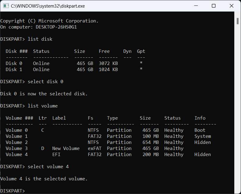 - Now type list volume and press Enter to display a list of all volumes on the selected disk. * Identify the volume number of the EFI (Extensible Firmware Interface) partition, which is typically formatted as FAT32 and may have an EFI label. * Enter select volume #, replacing # with the volume number of the EFI partition. To be clear, this assumes that you’re using a newer EFI bootloader for Windows (which is most likely for Windows 10 and Windows 11 installations).