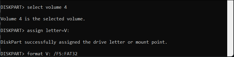 - To format the EFI partition as FAT32, type format V: /FS:FAT32 and press Enter, replacing V with the actual assigned letter.