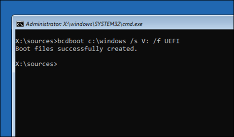 - Next, copy your BCD data from your Windows system partition to your EFI partition by typing bcdboot c:\windows /s V: /f UEFI and pressing Enter, where V: is the correct drive letter for your EFI partition (as explained above).