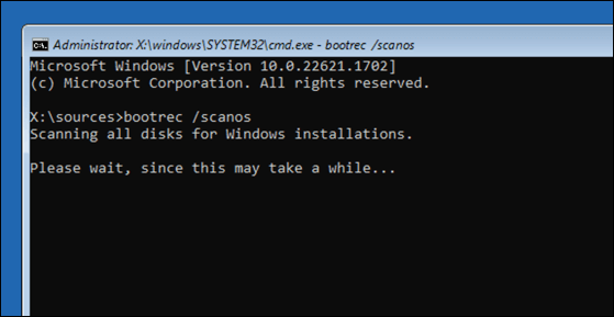 - Once the Command Prompt window opens, you’re ready to enter a series of commands to rebuild your BCD—start by typing bootrec /scanos and press Enter. This command scans all disks for installations compatible with Windows and displays the results.