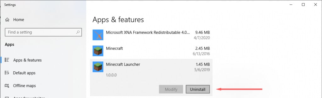 - Scroll down and click Minecraft Launcher then Uninstall. Wait for the process to complete.