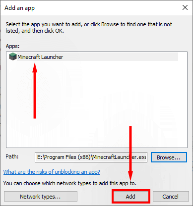 - Click Browse, find and select the Minecraft Launcher, and click Add.