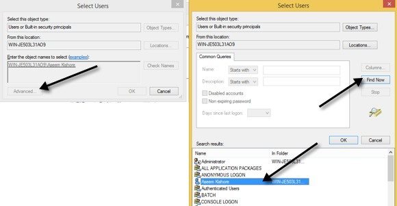 On the next dialog, click the Advanced button and then click Find Now. This will list out all users and groups on the system. Double-click the user you want to add.