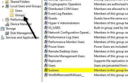Once you install Sudo for Windows, you need to add the user accounts that you to allow to have elevated privileges to a specific group created by the program called Sudoers. Right-click on My Computer or This PC and click on Manage. Then expand Users and Groups and click on Groups. You should see one called Sudoers.