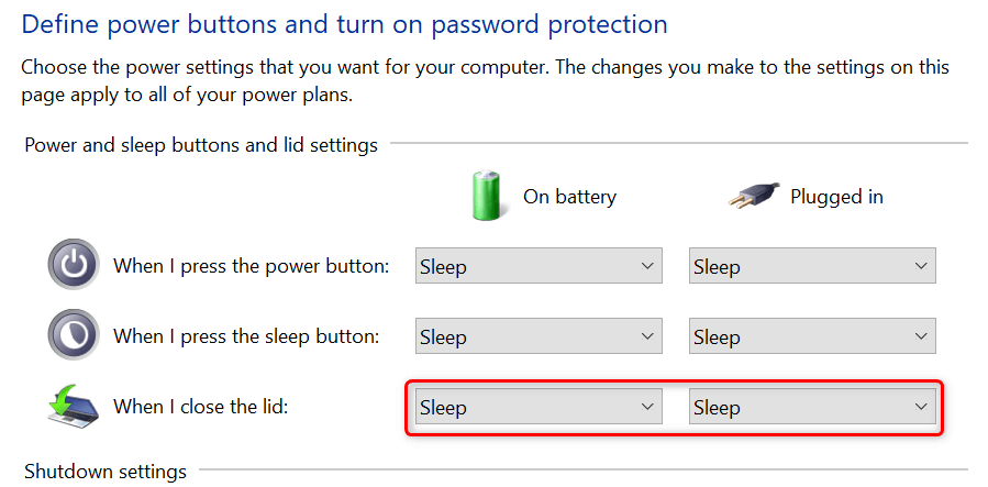 - Select **Sleep** from both **On battery** and **Plugged in** drop-down menus for the **When I close the lid** option.