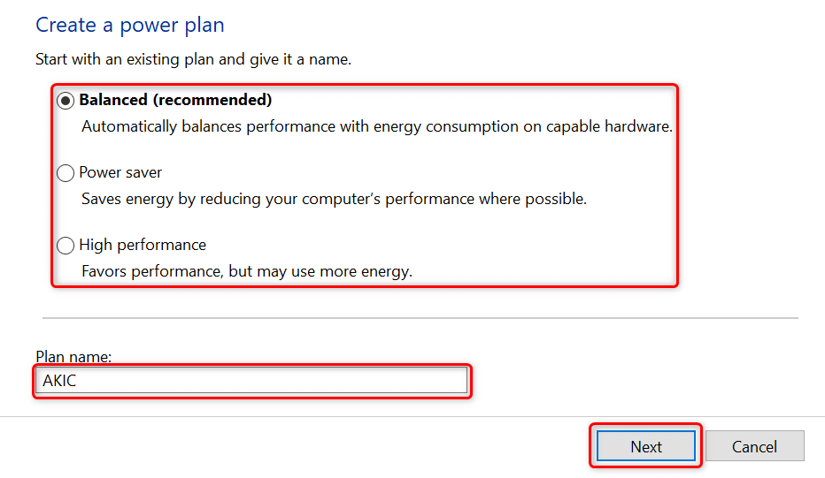 - Select an existing plan to copy settings from, type a name for your new power plan, and choose **Next**.