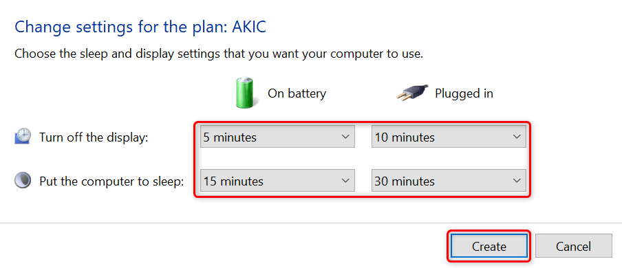 - Specify the display off and sleep settings, and then select **Create**.