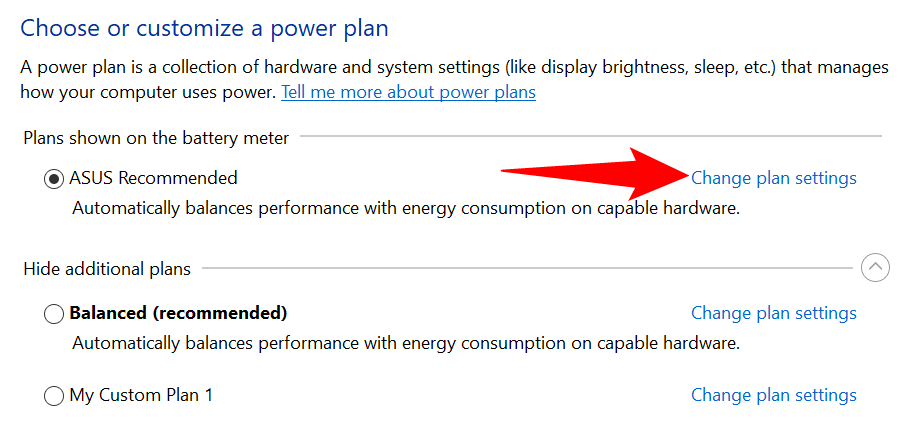 - Find your active power plan and select **Change plan settings** next to your plan.