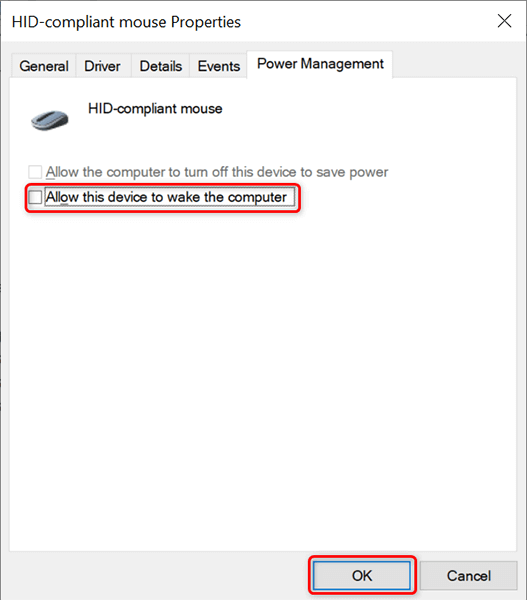 - Access the **Power Management** tab on the Properties window. * Disable the **Allow this device to wake the computer** option. Then, select **OK** at the bottom.