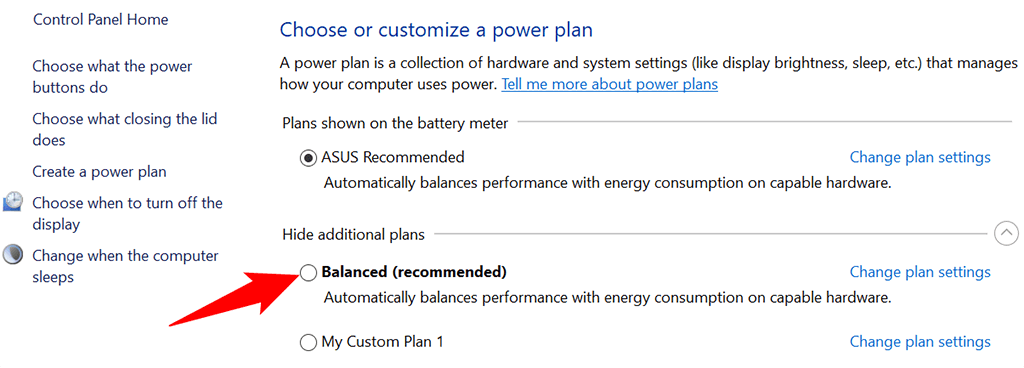 - You’ll see the power plans available on your PC. Select the radio button beside the plan that you’d like to activate.