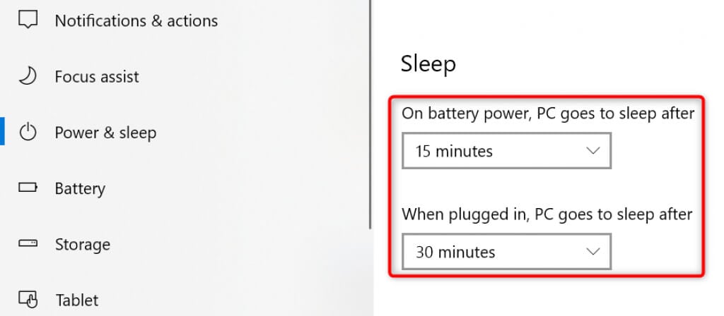 When you configure sleep settings for your PC, the first option to define is how long your PC should be in idle mode to enter sleep mode. You can choose different options for both when your machine is plugged into a power source and when your machine is running on battery.