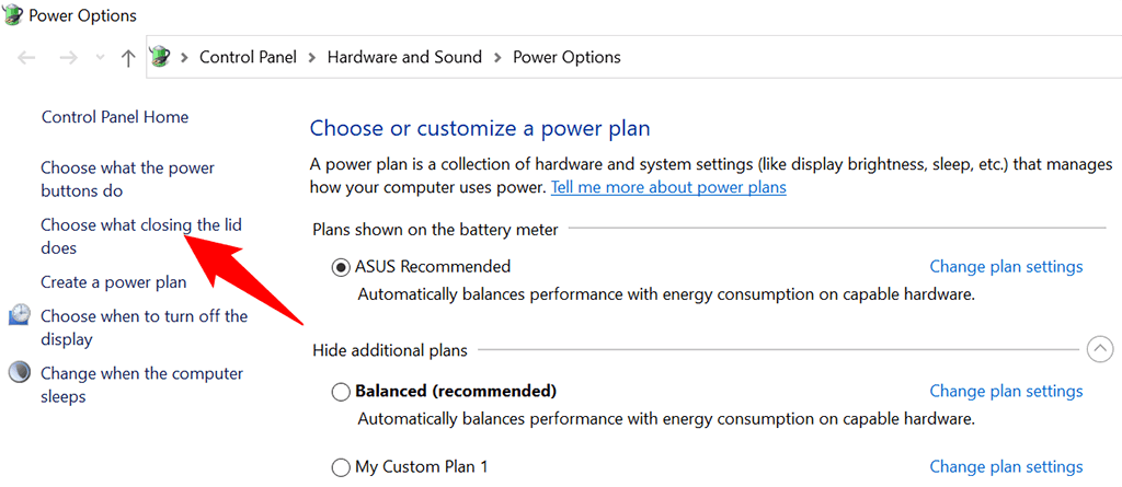 - Select **Choose what closing the lid does** from the left sidebar.