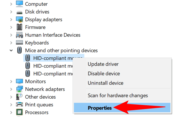 - Expand the **Mice and other pointing devices** section in Device Manager. * Right-click your mouse in the device list and select **Properties** from the menu.