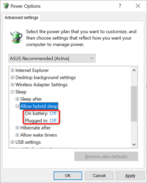 - Expand the **Sleep** option on the **Power Options** window. * Expand **Allow hybrid sleep** and choose **Off** for both **On battery** and **Plugged in** options.