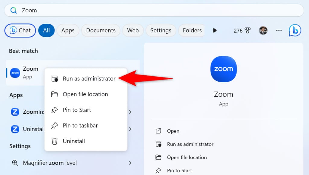 - Right-click the app and select Run as administrator.