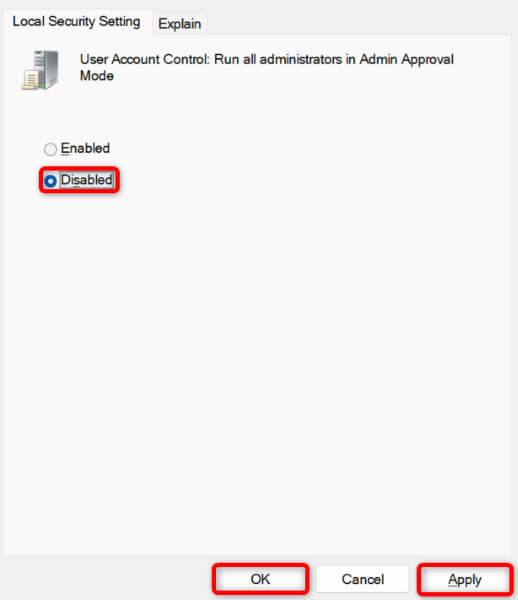 - Find and double-click User Account Control: Run all administrators in Admin Approval Mode on the right. * Choose Disabled and select Apply followed by OK.