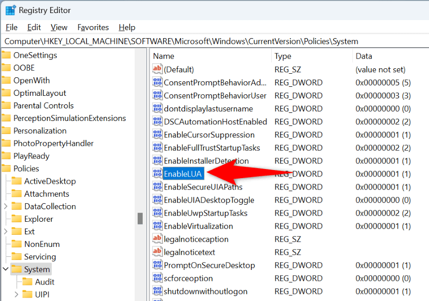- Open the Run dialog box by pressing Windows + R. * Type the following command in the box and press Enter: regedit * Select Yes in the User Account Control prompt. * Navigate to the following path in Registry Editor: HKEY_LOCAL_MACHINE\SOFTWARE\Microsoft\Windows\CurrentVersion\Policies\System * Double-click EnableLUA on the right pane.