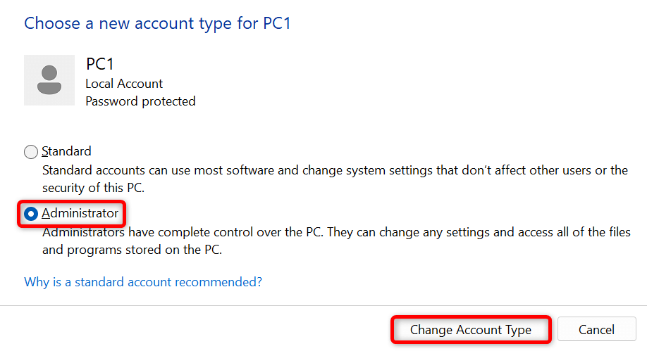 - Choose Administrator and select Change Account Type.