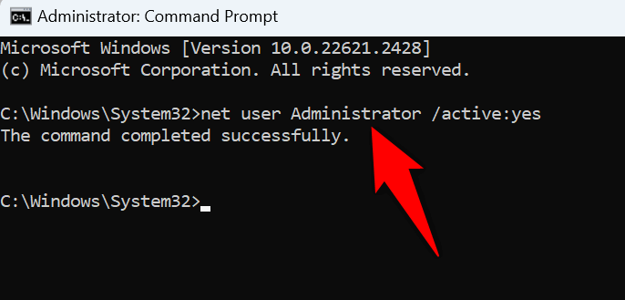 - Type the following command on the CMD window and press Enter: net user Administrator /active:yes