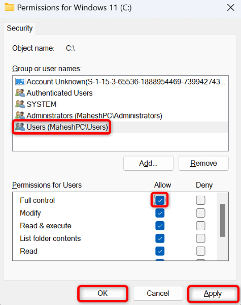 - Choose your user account in the Group or user names section, enable Allow next to Full control, and select Apply followed by OK.