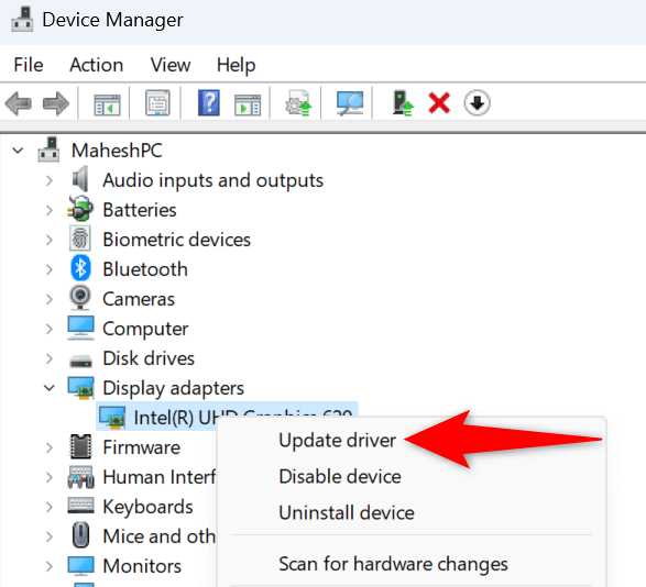 - Expand Display adapters, right-click your adapter, and choose Update driver.