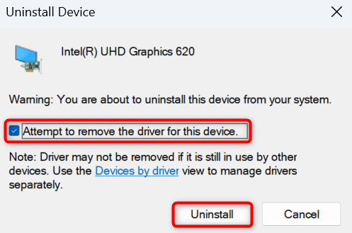 - Enable Attempt to remove the driver for this device and select Uninstall.