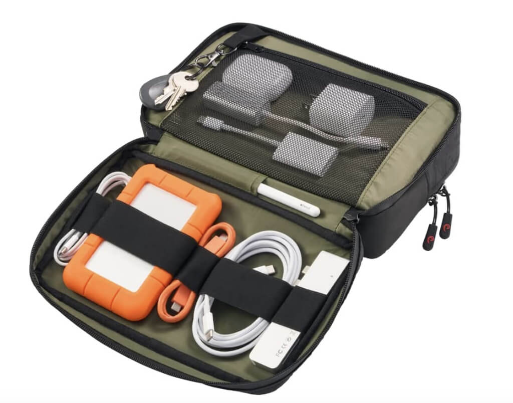 TechCapsule is an ultralight compact case with two main compartments and zippered mesh pockets that will help you keep your cables, chargers, and other items like keys, AirTag, Stylus/Apple Pencil, power banks, hard drives, phones, and even small tablets organized. The capsule is made with premium waterproof material that will protect your accessories from heat, cold, rain, snow, and mud.
