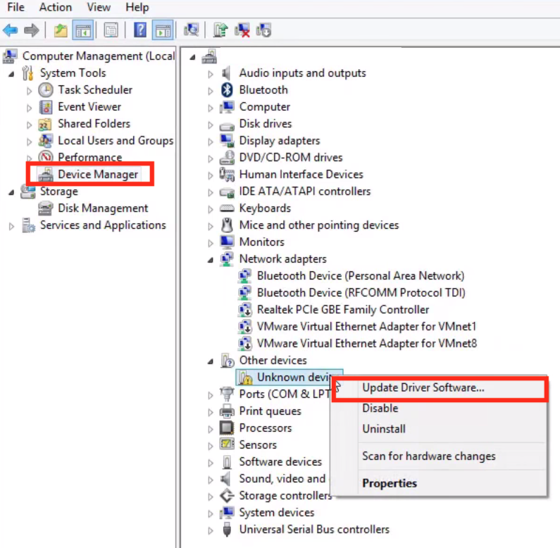 - Under Other Devices, find Unknown device and right-click it. Then select Update Driver Software.