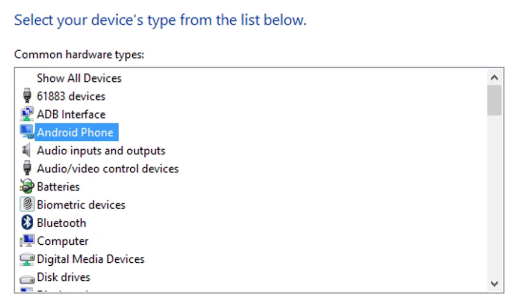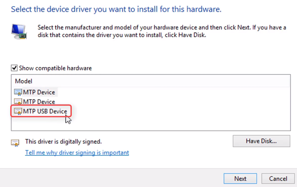 - From the list of devices, select **MTP USB Device** and select **Next** to confirm.